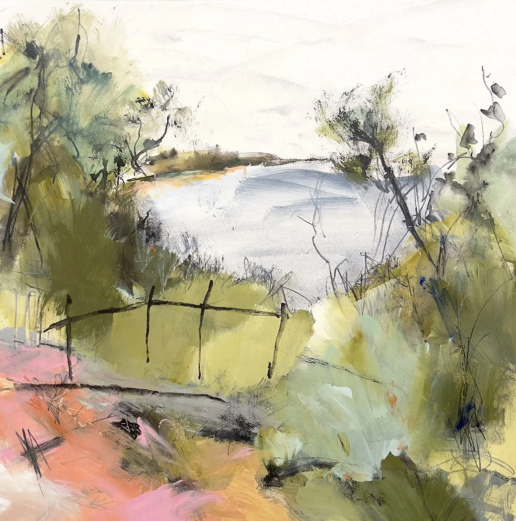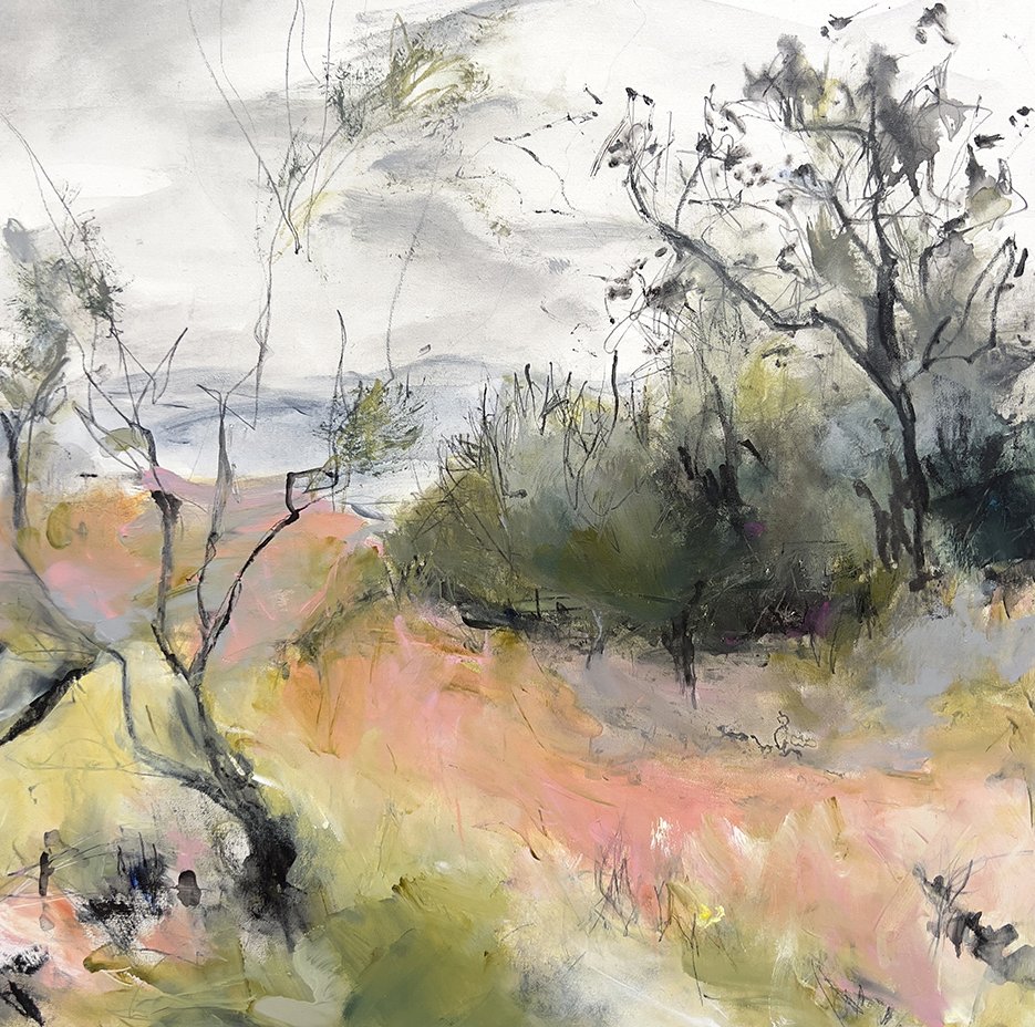 My paintings capture the energy and beauty of the natural environment. When I travel into the bush, I take graphite pencils, charcoal and a small palette of paints to record what I see and feel in my art journal. I collect sticks and bark from the landscape for mark making in my work on canvas.
